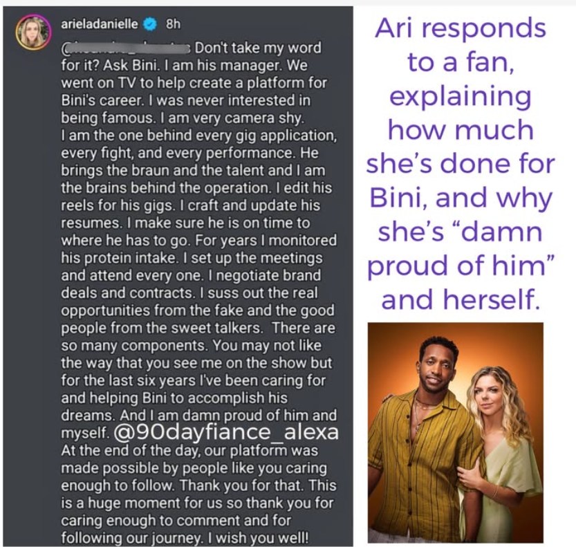 On February 12th, 2025, @90dayfiance_alexa screenshotted a response Ari made to a comment a fan made about her and Bini’s career after he appeared during the Super Bowl. She describes how she is currently his manager and has helped Bini grow his career to get where he is now. “I am his manager. We went on TV to help create a platform for Bini’s career. I was never interested in becoming famous.” This quote made lots of fans question if Ari and Bini’s marriage troubles were even real. Did they get on 90 Day: The Last Resort to promote Bini’s stunt resume?