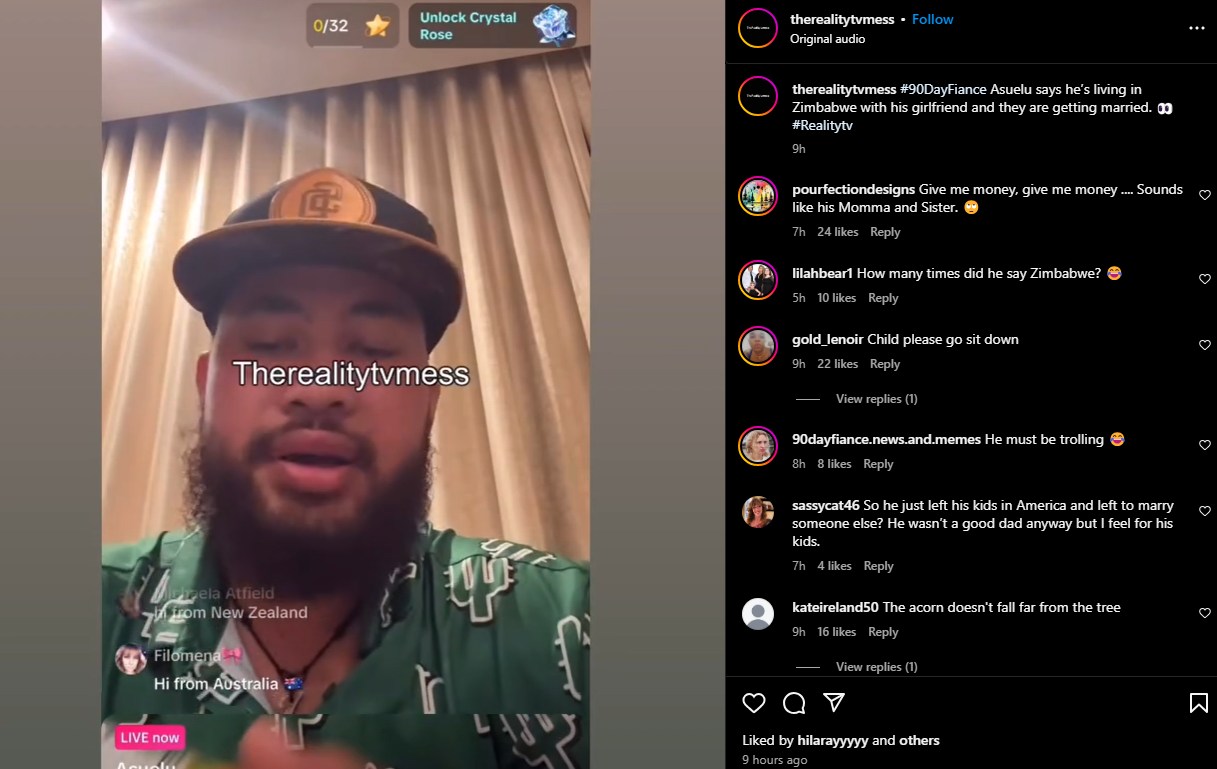 90 Day Fiancé blogger therealitytvmess posted a clip from Asuelu’s recent TikTok live stream. In the stream, Asuelu reveals that he is going to marry his girlfriend in Zimbabwe the next day!