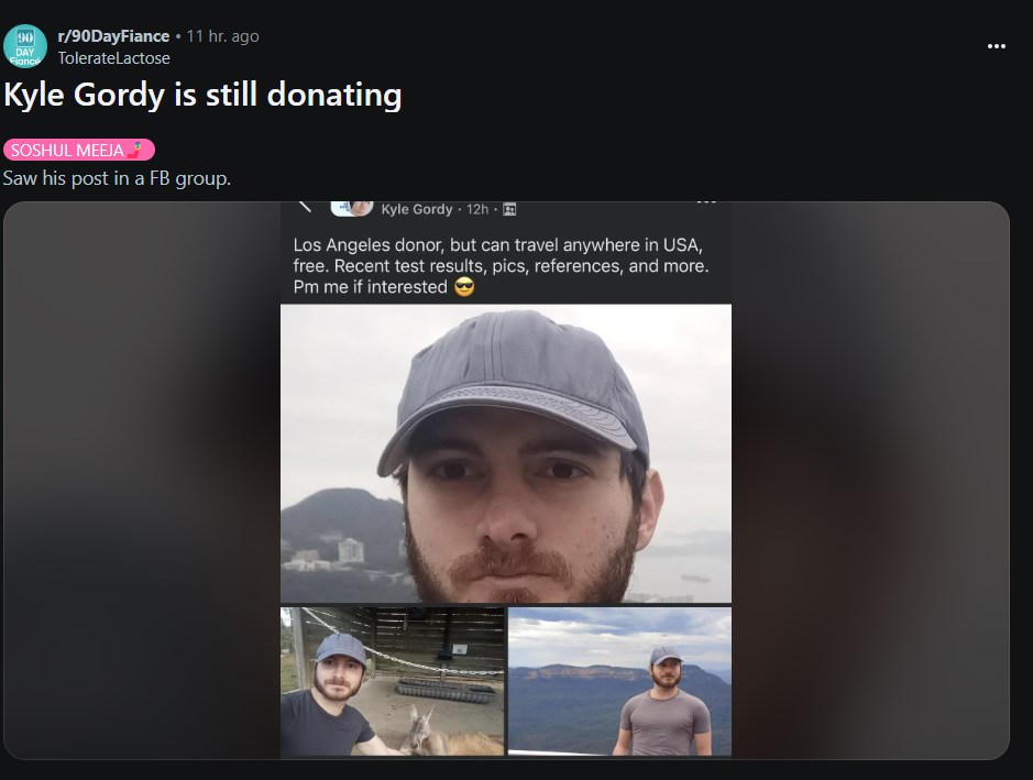 Reddit user TolerateLactose posted about finding Kyle Gordy advertising himself in a Facebook group. From Kyle’s post, we learn that he is still living in Los Angeles, but continues to travel to anyone interested in his “donation.” However, this isn’t the first time Kyle has been mentioned as being on Facebook.