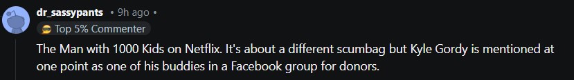Multiple comments state how Kyle was also featured in a Netflix documentary called “Man with 1000 Kids.” “It’s about a different scumbag but Kyle Gordy is mentioned at one point as one of his buddies in a Facebook group for donors” states commenter dr_sassypants.