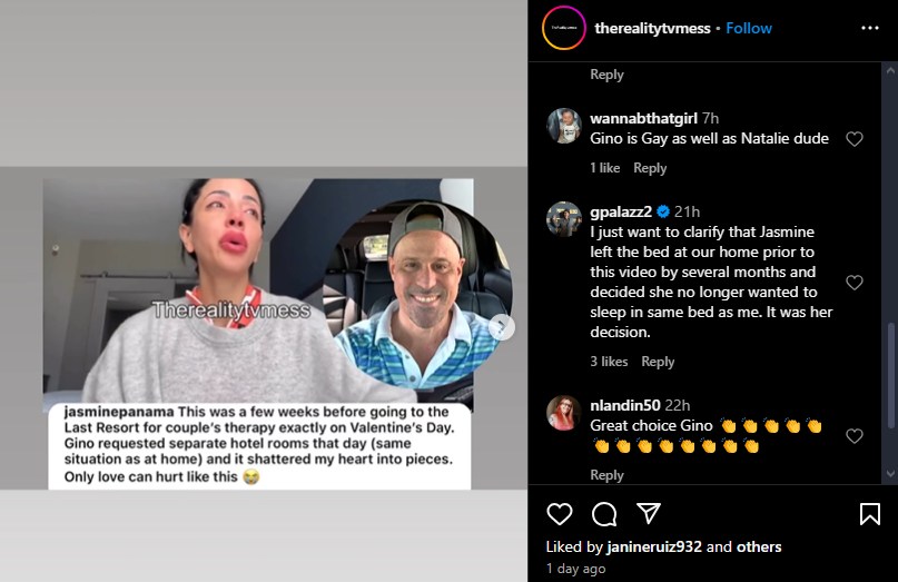 On a repost made by 90 Day blogger therealitytvmess, Gino responded to Jasmine’s video in a comment. “I just want to clarify that Jasmine left the bed at our home prior to this video by several months and decided she no longer wanted to sleep in same bed as me. It was her decision.” This could be referring to Gino’s claims of Jasmine cheating on him when she left their home for months on The Last Resort. If this is true, then it could maybe explain his choice of sleeping separately from Jasmine as a “taste of her own medicine.”
