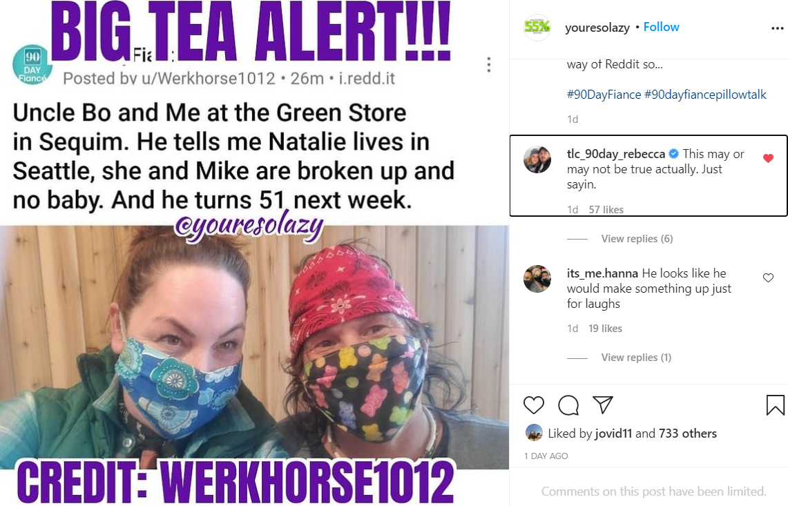 When this info leak was reposted from Reddit onto the Instagram 90 Day fan page @youresolazy, co-stars of Mike and Natalie’s on Season 8 of 90 Day Fiancé, Jovi Dufren liked the post and Rebecca Parrott commented, “This may not be true actually. Just saying.”