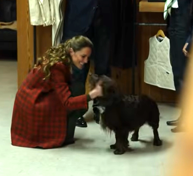 Princess Catherine was welcomed into the factory by an adorable cocker spaniel. Kate and William have their own cocker spaniel, named Orla. The dog at the textile factory was named Barney and looked very dapper, wearing his little denim bow tie.