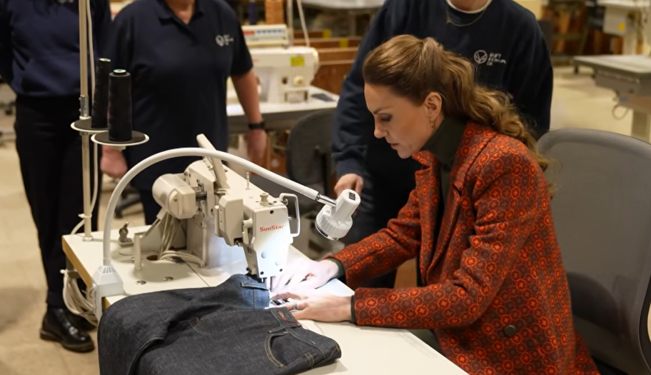 During her solo visit to the Hiut Denim Factory in Wales earlier today, Kate Middleton took part in the manufacturing process, sewing a label onto a pair of jeans as a gift for Prince William. The label proudly read, “Made in Britain.”