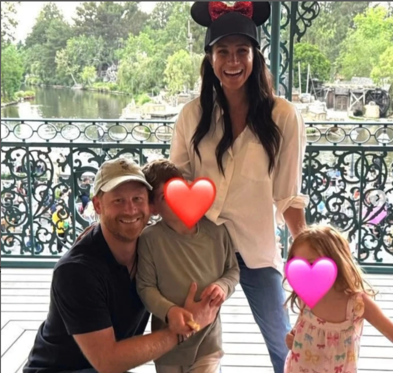 The one telling detail in Harry and Meghan’s photo from their Disneyland trip was Meghan standing behind her two children, wearing a Mickey Mouse hat. Prince Harry was pictured kneeling, and their kids had colorful cartoon hearts covering their faces.