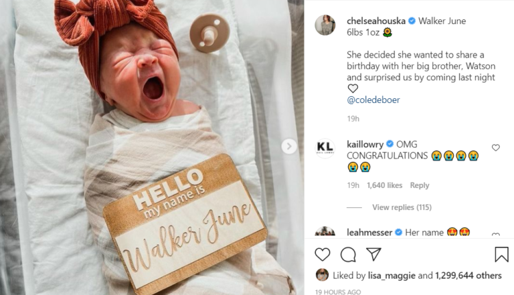 Chelsea captioned the photo ‘Walker June , 6lbs 1oz ?, She decided she wanted to share a birthday with her big brother, Watson and surprised us by coming last night?