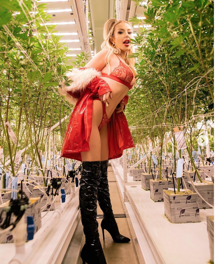 I am amazed that Instagram didn’t pull this photoshoot for promotion of illicit substances, but, I suppose times are changing. Tana Mongeau posted a series of IG photos with her in festive lingerie posing at what appears to be a cannabis factory.